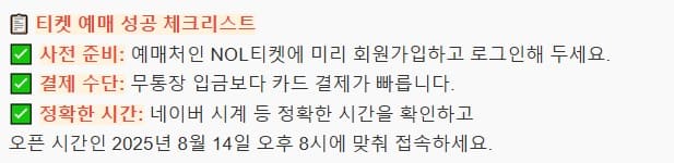 예매·등급·공연시간은 주최 측 사정으로 변경될 수 있으니, 예매 페이지 공지를 항상 확인하세요.